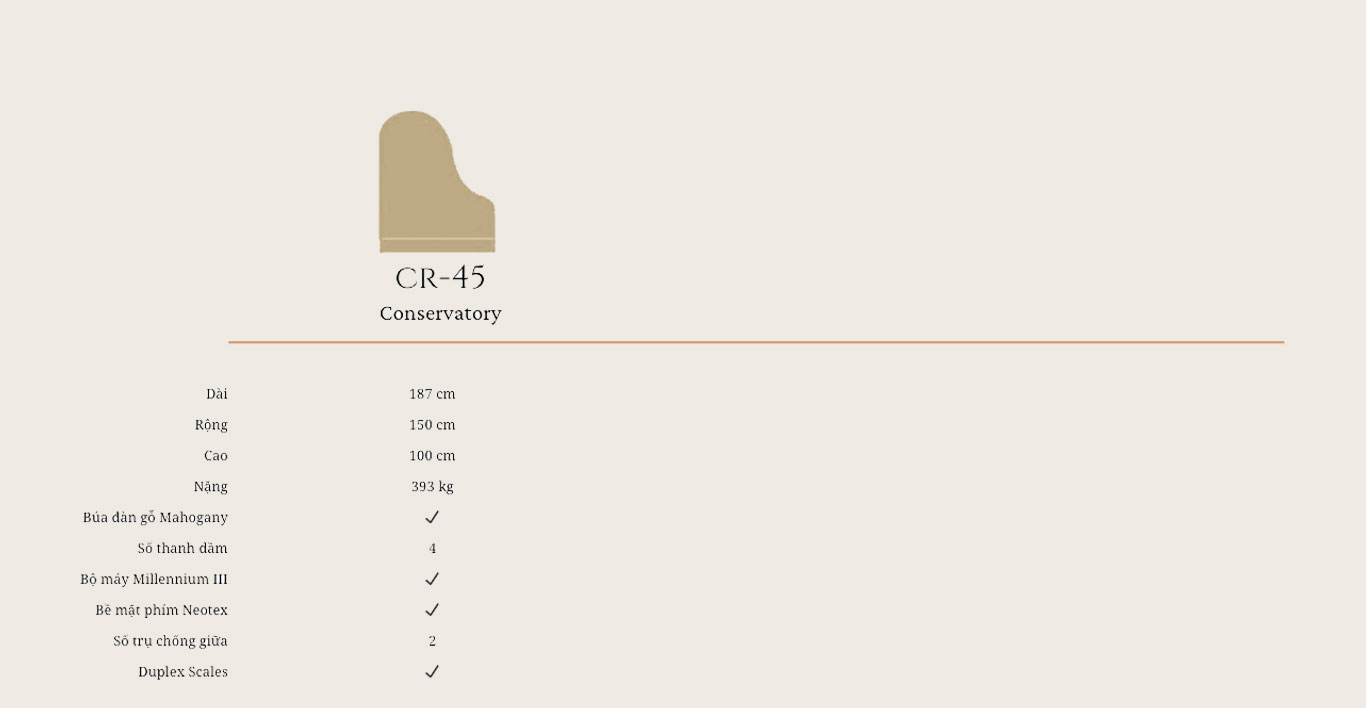 Không chỉ gây ấn tượng về mặt thị giác, CR-45 mang chất lượng âm thanh chuẩn grand piano cao cấp của Nhật Bản, tương đương một cây đại dương cầm truyền thống. Đây là phiên bản giới hạn đặc biệt, chỉ 3 cây được chế tác mỗi năm trên toàn thế giới, mang đến giá trị độc bản và đẳng cấp vượt thời gian cho bất kỳ không gian nào mà nó hiện diện.