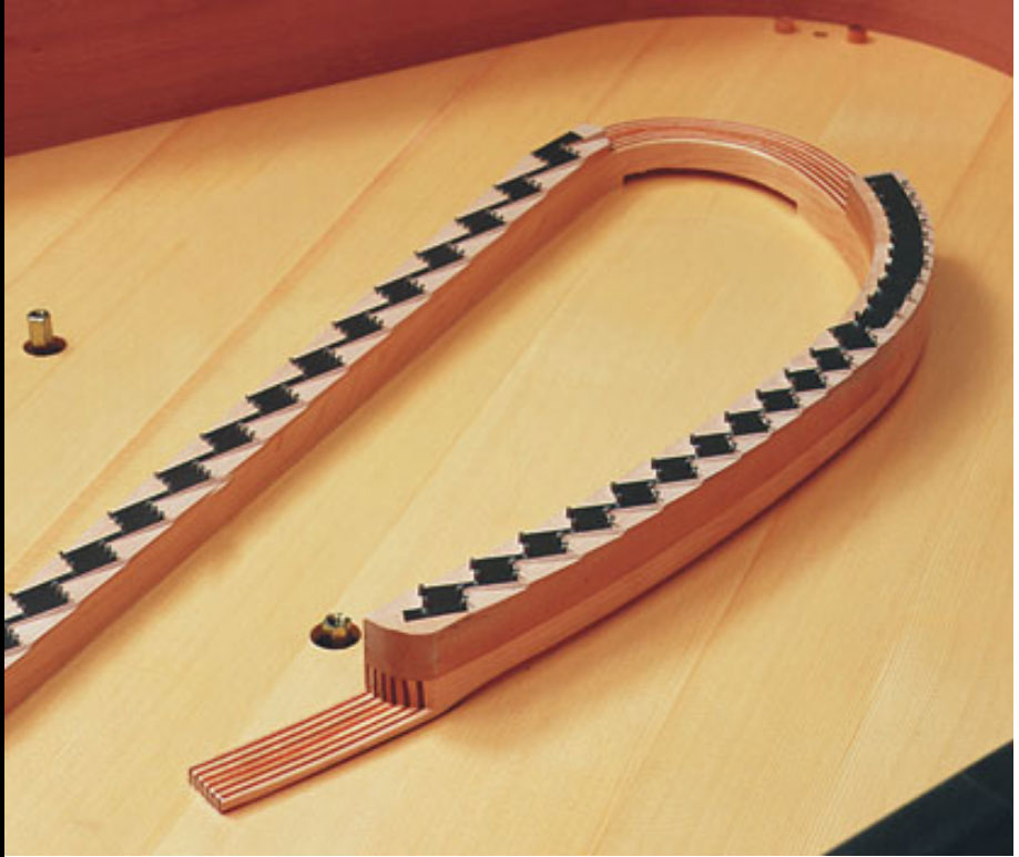 Ngựa đàn khu vực âm cao được ghép dọc từ 13 lớp gỗ thích và gỗ Gụ (Mahogany), giúp tăng cường độ bền chắc và tối ưu khả năng truyền tải năng lượng âm thanh.